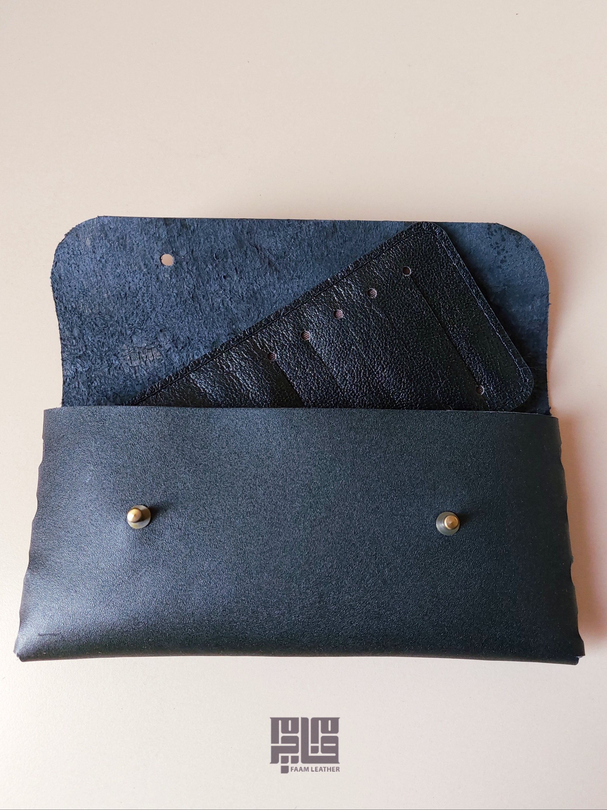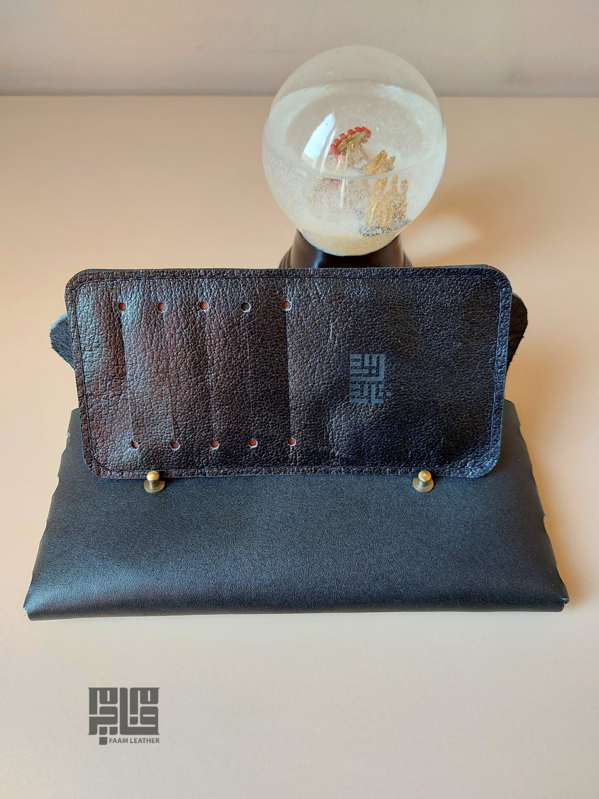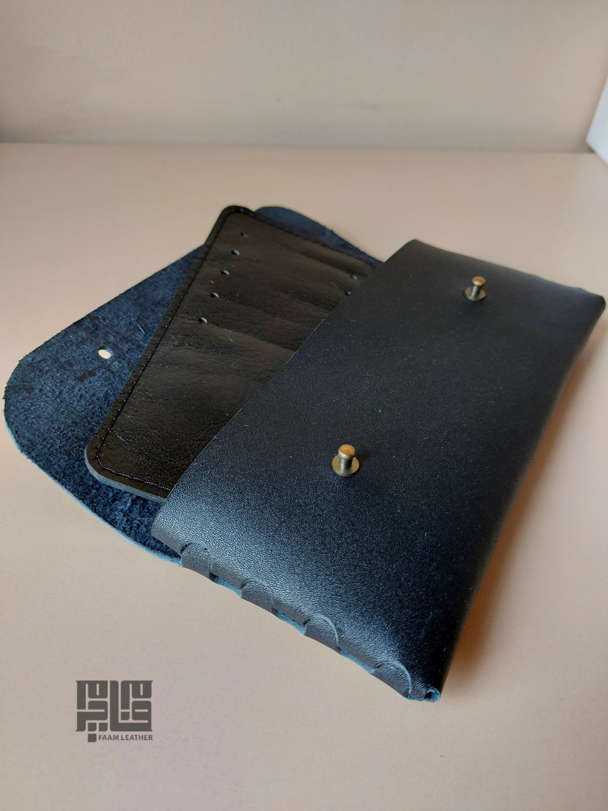 - ساخت این کیف بدون دوخت و با درهم تنیده شدن چرم انجام شده.